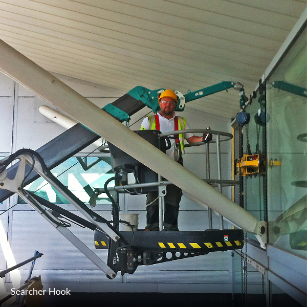 By using the optional searcher hook, the highest reach of the crane can be achieved even in places with height limitations due to ceilings or under the roof eaves. This is very often used for glazing works.